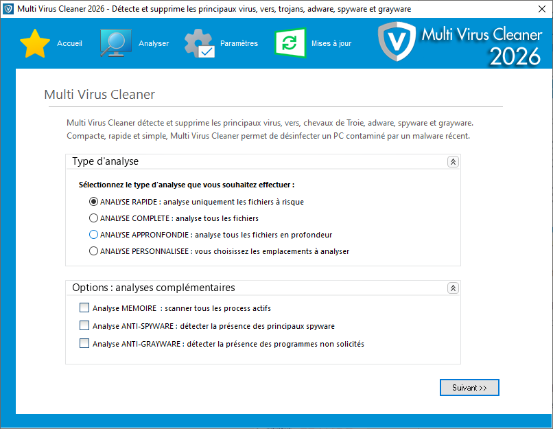 Cliquez pour agrandirMulti Virus Cleaner 2026 est un outil gratuit qui permet de détecter et supprimer les virus, chevaux de Troie, vers, spyware, adware et grayware les plus courants.  Il détecte plus de 3,8 millions de variantes de malwares.